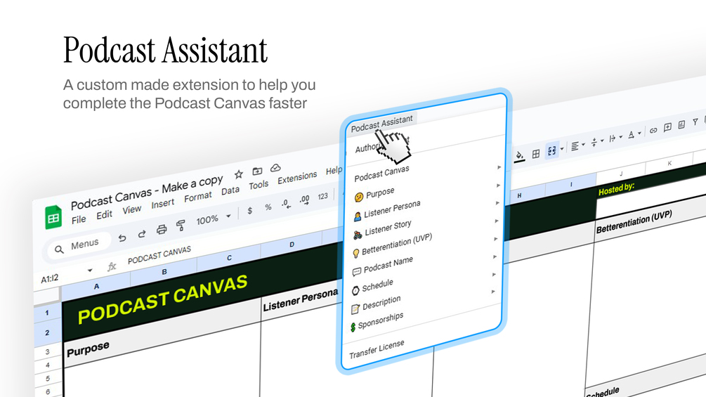 This purchase includes the Podcast Canvas Template, the AI powered Podcast Assistant Extension, and a Video Mini-Course to guide you step by step through the process!